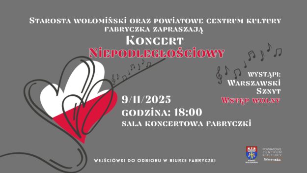 Z okazji 107. rocznicy Narodowego Święta Niepodległości zapraszamy Wszystkich Państwa na KONCERT NIEPODLEGŁOŚCIOWY W FABRYCZCE. 9 listopada o godz. 18:00, w sali koncertowej Fabryczki odbędzie się wyjątkowy KONCERT w wykonaniu Zespołu WARSZAWSKI SZNYT. Zachęcamy do aktywnego udziału we wspólnym śpiewaniu! Zaśpiewamy: „My, Pierwsza Brygada”, „Marsz Pierwszej Kadrowej”, „Rozkwitały pąki białych róż”, „Piechota”, „Wojenko, wojenko” „Wolność”…