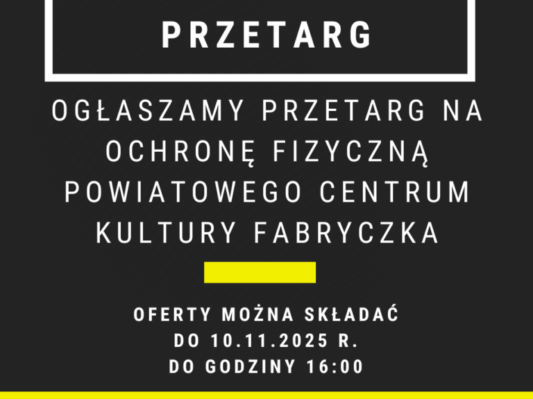 📢 Ogłoszenie o przetargu na ochronę fizyczną Powiatowego Centrum Kultury „Fabryczka”! Powiatowe Centrum Kultury „Fabryczka” ogłasza przetarg na świadczenie usług ochrony fizycznej obiektu. 🔒 Jeśli Twoja firma…