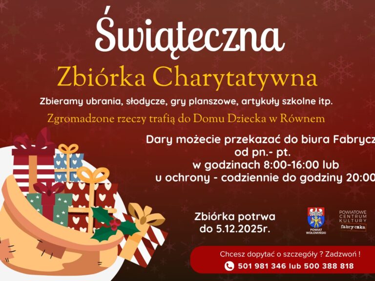 🎄 ŚWIĄTECZNA ZBIÓRKA CHARYTATYWNA! 🎁 Zbliżają się święta – czas dzielenia się dobrem i radością! ❤️ Powiatowe Centrum Kultury „Fabryczka” zaprasza do udziału w wyjątkowej…