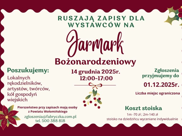 🎄✨ DRODZY WYSTAWCY! ✨🎄 Rozpoczynamy zapisy na Powiatowy Jarmark Bożonarodzeniowy w Fabryczce, który odbędzie się 14 grudnia (niedziela) w godzinach 12:00–17:00! 🎁🎨 Jeśli tworzysz wyjątkowe…