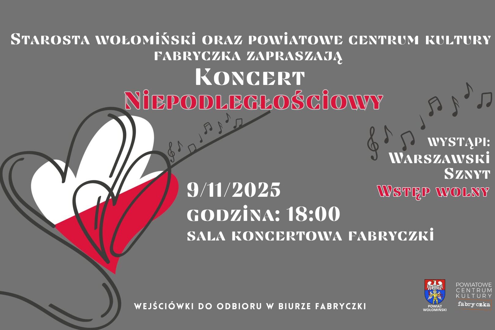 Z okazji 107. rocznicy Narodowego Święta Niepodległości zapraszamy Wszystkich Państwa na KONCERT NIEPODLEGŁOŚCIOWY W FABRYCZCE.