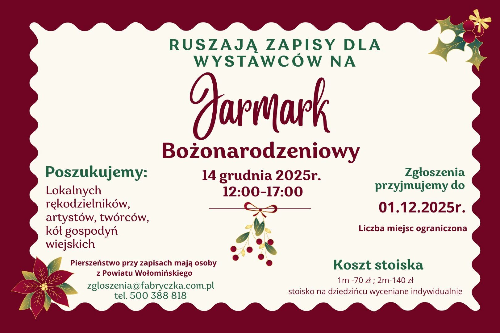 Rozpoczynamy zapisy na Powiatowy Jarmark Bożonarodzeniowy w Fabryczce, który odbędzie się 14 grudnia (niedziela) w godzinach 12:00–17:00! 🎁🎨